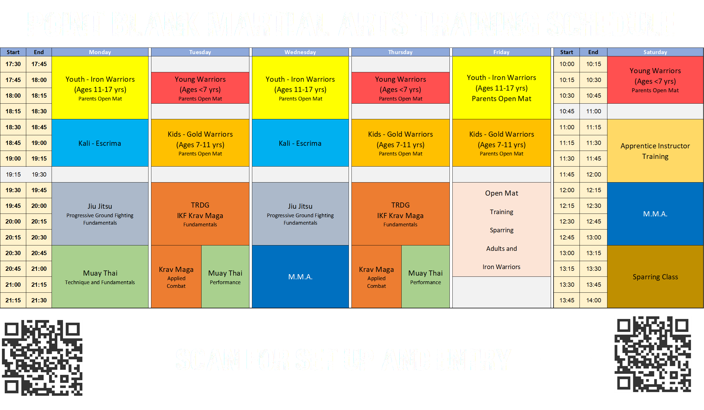 | Kali/Escrima | Monday 6:30–7:15pm · Wednesday 6:30–7:15pm |